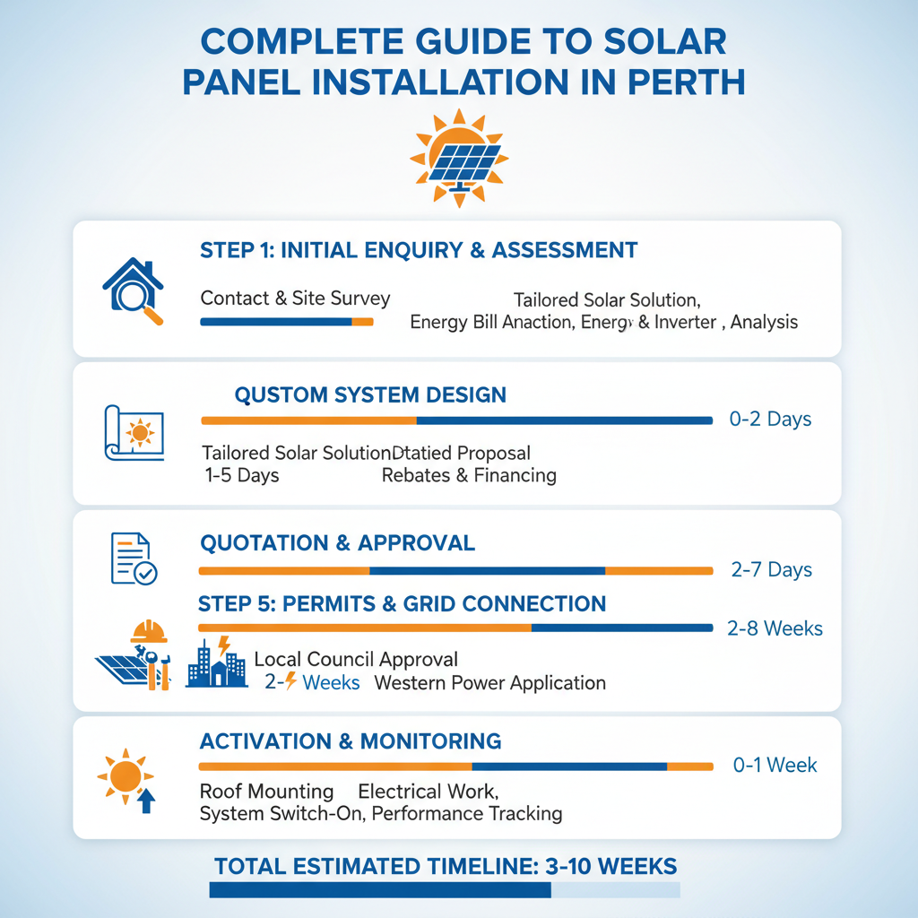 Get My Free Quote →Q: How long does the entire solar installation process take in Perth? A: From initial consultation to grid connection, the process typically takes 4-8 weeks, depending on Western Power approval times and installer scheduling. The physical installation usually takes 1-3 days.